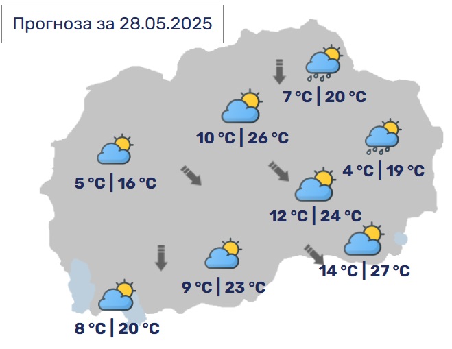 И утре времето ќе биде променливо облачно со сончеви периоди. Попладне на повеќе места ќе биде нестабилно со пороен дожд и грмежи. Ќе дува слаб до умерен ветер од северозападен правец. Максималната температура ќе се движи од 17 до 24 Целзиусови степени.