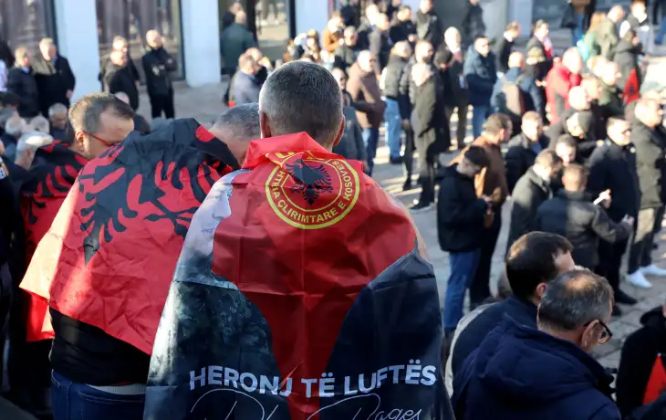 Додека траеја обраќањата, учесниците на протестот скандираа во знак на поддршка на ОВК. Се вееја знамиња на Албанија, Косово и САД, а дел од присутните носеа и фотографии од обвинетите.