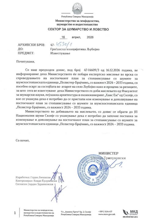 „Министерството го доби мислењето од Факултетот за шумски науки, пејсажна архитектура и екоинженеринг ‘Ханс Ем’ од Скопје, со кое се укажува дека е потребно да се пристапи кон изменување и дополнување на постоечкиот план за стопанисување со шумите во шумско-стопнанската единица Пелистер-Брајчино со важност 2024-2033. Со допис се одбративме до ЈП ‘Национални шуми’ да започнат со постапка за измени“, се вели во соопштението на Министерството за земјоделство.