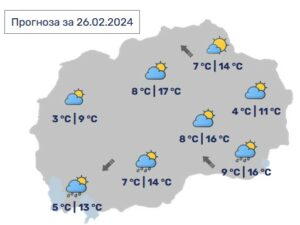 Во текот на денот темпеарутирите ќе се искачат од 9 до 16 степени, а најтопло со 17 степени се прогнозира да биде во скопската котлина.