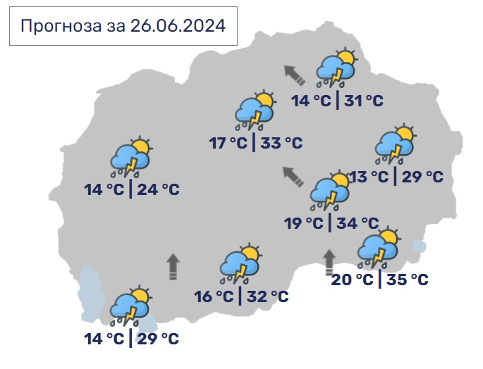 Утре времето ќе биде променливо облачно и нестабилно со пороен дожд и грмежи. На повеќе места ќе има појава на невреме со обилен пороен дожд за кратко време, грмежи, силен ветер (над 60 км/час) и град. Дневните температури ќе се движат од 26 до 34 Целзиусови степени.