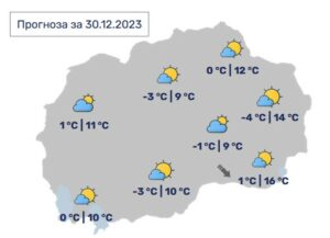 Времето денеска ќе биде променливо облачно и тивко. Наутро и претпладне по котлините со појава на магла која во средината на денот ќе ослаби. Минималната температура ќе биде во интервал од -4 до 1, а максималната ќе достигне од 7 до 16 степени.