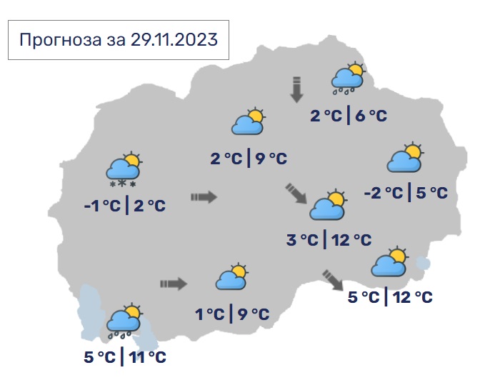 Во Скопје променливо облачно со услови за локален слаб дожд. Ќе дува слаб до умерен ветер од северен правец. Минималната температура ќе се спушти до 2, а максималната ќе достигне до 9 степени.