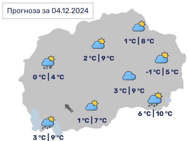 Дневните температури ќе се движат од 2 до 10 Целзиусови степени.