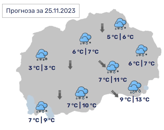 Во Скопје облачно и студено претпладне со врнежи од дожд кои попладне и до крајот на денот ќе преминуваат во снег и се очекува да се формира помала снежна покривка, особено во повисоките делови од котлината. Ќе дува засилен ветер од северен правец.