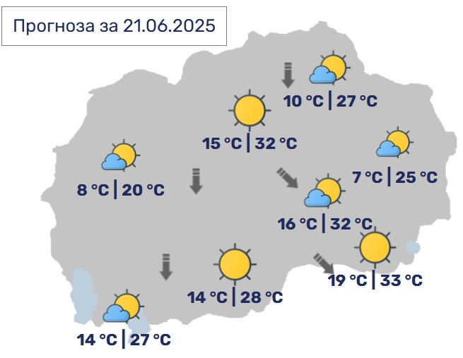 Утре времето ќе биде сончево и малку посвежо со мала до умерена локална облачност. Ќе дува слаб до умерен ветер од северен правец. Минималната температура ќе се движи од 6 до 17, а максималната од 26 до 34 Целзиусови степени.