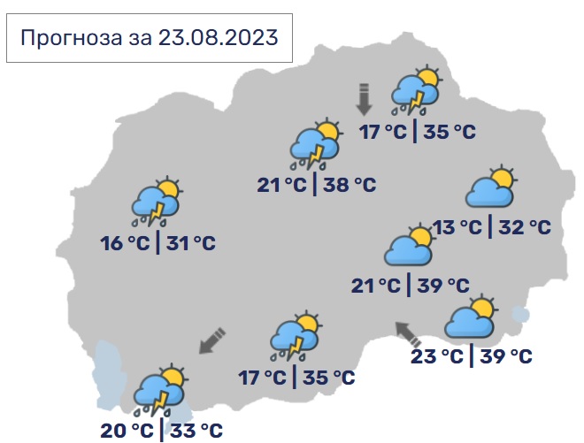 Во Скопје сончево и многу топло со мала до умерена облачност, а попладне во делови од котлината со услови за појава на пороен дожд со грмежи. Ќе дува слаб до умерен северен ветер.