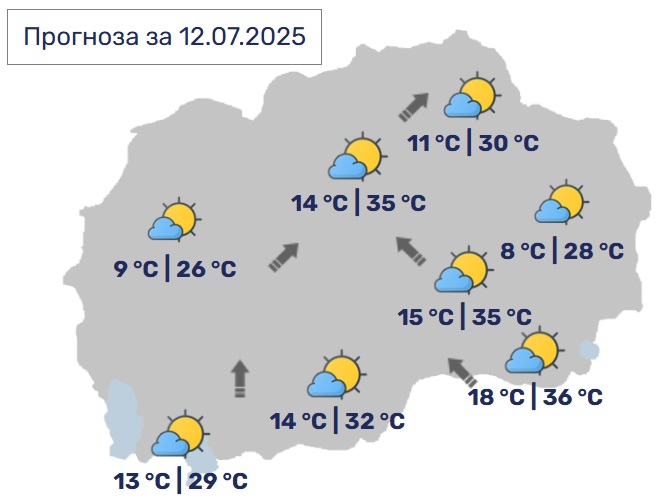 Утре времето ќе биде сончево и топло со мала до умерена локална облачност и дневни температури до 38 Целзиусови степени. Ќе дува слаб до умерен ветер од јужен правец.