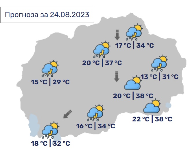 Во Скопје сончево и многу топло со мала до умерена облачност, попладне во делови од котлината ќе има услови за појава на пороен дожд со грмежи и засилен ветер. Ќе дува слаб до умерен ветер од северен правец.