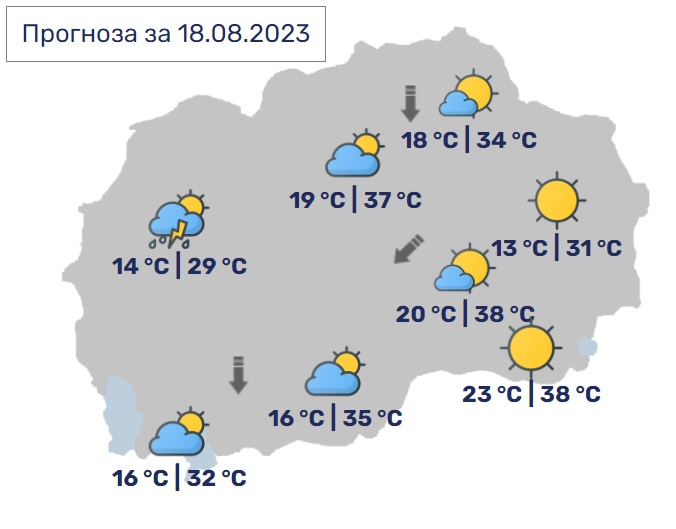 Минималната температура ќе биде во интервал од 13 до 23, а максималната од 31 до 38 Целзиусови степени. УВ индексот ќе биде 8.