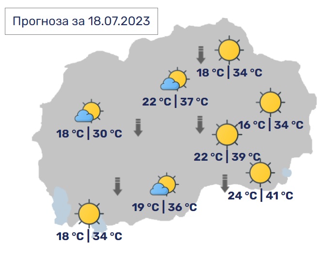 И утре времето ќе биде сончево и многу топло со слаб до умерен ветер претежно од јужен правец и дневни температури до 42 степени. УВ индексот ќе биде 10. Во Скопје сончево и многу топло со слаб ветер од јужен правец.