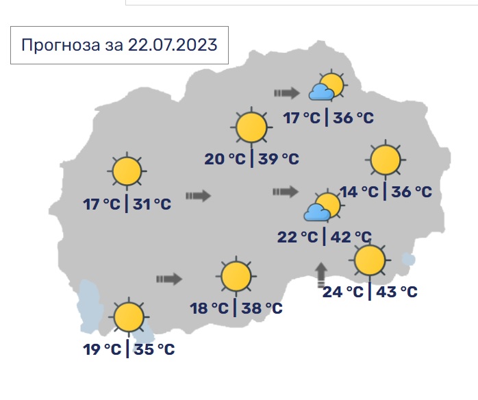 И утре времето ќе биде сончево и многу топло со мала локална облачност. Ќе дува умерен, наместа засилен ветер, во западните делови од западен, а долж Повардарието од северозападен правец. УВ индексот ќе биде 9.