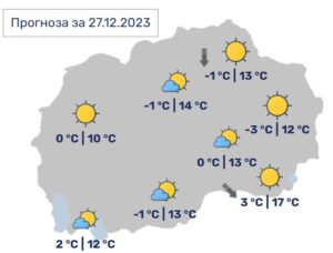 Утре времето ќе биде сончево и релативно топло, по котлините ќе има појава на магла и пониска дневна температура. Ќе дува слаб јужен ветер. Вo Скопје претпладне со појава на магла, која попладне ќе се намали.