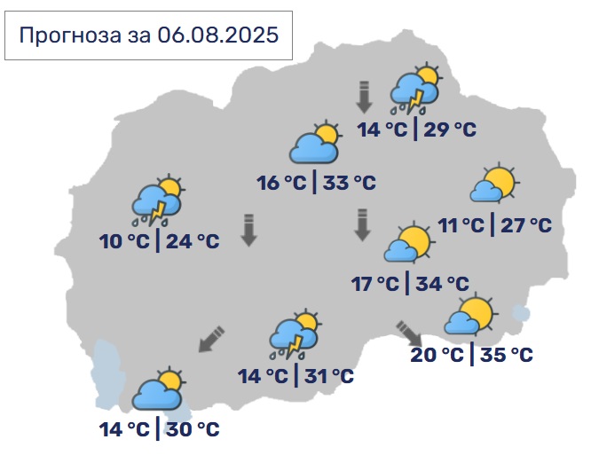 Утре времето ќе биде сончево со мала до умерена облачност и дневни температури до 36 Целзиусови степени. Ќе дува умерен, наместа долж Повардарието повремено засилен ветер од северен правец.