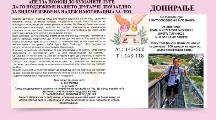 „Повикуваме сите да се приклучат со донирање преку повик на телефонските броеви, А1: 143 500 и Телеком: 143 118. Да бидеме хумани и да помагаме, бидејќи младиот Леонид заслужува да живее, а секој од нас може да се најде на другата страна од приказната. Му посакуваме на младиот Лео брзо оздравување“, порача Честоева.
