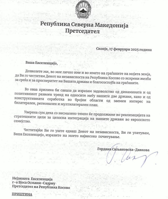 „Согласно дипломатската пракса, претседателката Сиљановска-Давкова на 17 февруари, преку Министерството за надворешни работи и надворешна трговија, упати писмо-честитка до нејзиниот хомолог, претседателката на Република Косово, Вјоса Османи-Садриу.