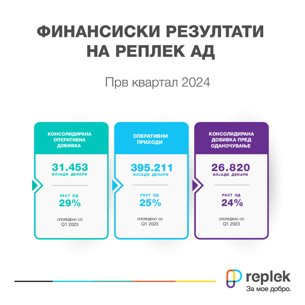 Инаку, растот на приходите од продажба се одрази и на растот на консолидираната добивка пред оданочување на „Реплек АД“, која за првите три месеци од оваа година бележи зголемување за 24 % во однос на истиот период од минатата година.