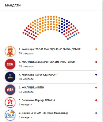 Првичните резултати од денешните парламентарни избори што Државната изборна комисија ги објавува на својата веб-страница, покажуваат дека од обработени над 95 проценти од гласовите, Коалицијата Твоја Македонија на ВМРО-ДПМНЕ има освоено 411.023 (43,14 отсто) или 59 мандати во новиот 120 член собраниски состав, Коалицијата за европска иднина предводена од СДСМ 145.329 (15,25 отсто) – 19 пратеници, Европски фронт на ДУИ 133.210 (13,98 отсто) – 18 пратеници, Коалицијата од албанскиот опозициски блок Вреди 103.649 (10,88 отсто) – 13 мандати, Левица има 64.484 гласа (6,77 отсто) – 6 пратеници, а Движење ЗНАМ – За наша Македонија 50.576 (5,31 отсто) – 5 пратеници. Останатите партии и коалиции кои учествуваа на изборите имаа под еден процент гласови.