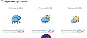 Во сабота ќе има значителна промена на времето. Под влијание на влажен и студен бран ќе има врнежи претежно од снег, кои наместа ќе бидат пообилни, особено во западните делови. На планините ќе се формира значителна снежна покривка над 30 сантиметри, а во пониските места од три до десет. Ќе дува засилен северен ветер, особено долж Повардарието и температурите значително ќе опаднат. Локални врнежи од снег ќе има и во недела претпладне, а од понеделник времето ќе биде стабилно со ниски утрински температури.
