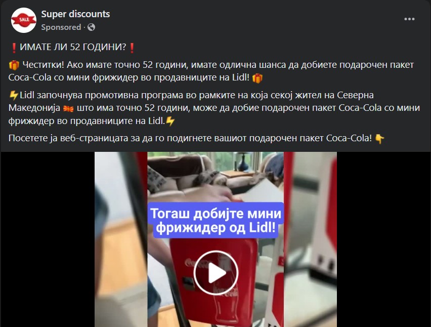 Според инструкциите наведени во видеото доколку некој од граѓаните поверува во можноста да добие награда од Лидл тогаш лесно пополнува мини анкета во која треба да го наведе името, годината на раѓање по што експресно добива потврда дека има токму онолку години колку што се потребни за да ја добие наградата мини фрижидер со пијалокот кока кола. По ова веб страницата ве води на следното ниво на кое треба да оставите лични податоци како што се вашето име и презиме, адреса на живеење и телефонски број по што треба да платите „само“ 125 денари за достава на наградата.