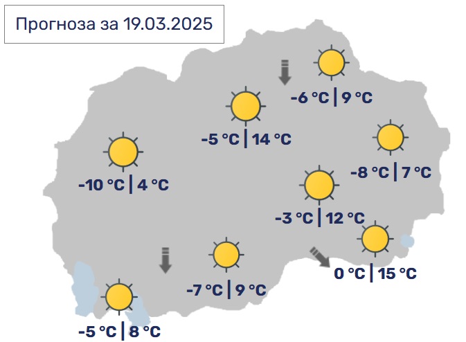 Утре наутро времето ќе биде студено, а преку денот претежно сончево. Ќе дува слаб до умерен ветер од северозападен правец. Минималната температура ќе се движи од -9 до -1, а максималната од 10 до 18 Целзиусови степени.