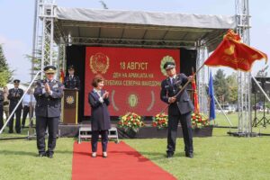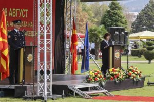 „Додека го прославуваме овој празник, дел од припадниците на Армијата се борат со огнените стихии ширум државата. Во овој миг помагаат во гаснењето, заштитата на граѓаните и добрата…Години наназад редовно се ангажираше во поддршката на институциите во справувањето со елементарните непогоди и со кризните состојби. Секогаш тоа го правеше професионално и пожртвувано, затоа Армијата континуирано ужива највисока доверба кај македонските граѓаните“, истакна таа.
