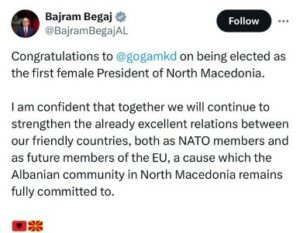 „Честитки, Гордана Сиљановска-Давкова, првата жена избрана за претседател на Република Северна Македонија. Убеден сум дека заедно дополнително ќе ги зајакнеме традиционално многу добрите односи меѓу нашите пријателски земји, како земји членки во НАТО и идни членки во ЕУ, за што Албанците во РСМ остануваат целосно ангажирани“, напиша Бегај во објавата на платформата Х.
