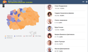 Според податоците на ДИК, Гордана Сиљановска Давкова освои 40,08 отсто од гласовите или, вкупно 362.682 гласови, додека Стево Пендаровски 19,93 отсто од гласовите или, 180.306 гласови. Сиљановска Давкова и Пендаровски силите повторно ќе ги одмерат во вториот круг од изборите на 8 мај.