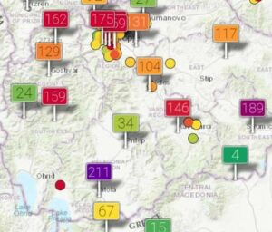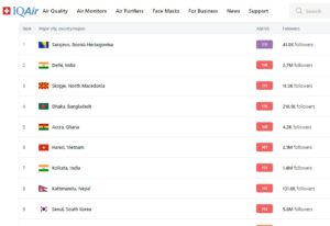 Искачувањето на Скопје на листата на Ервижувал на 100 големи или главни градови, започна уште прексиноќа и постојано е меѓу десетте градови според лошиот квалитет на воздухот, дефиниран како нездрав. Во Битола и Сараево, главниот град на Босна и Херцеговина воздухот е дефиниран како многу нездрав. Waqi.info, како што се гледа од илустрацијата, воздухот и во Струмица го дефинира како многу нездрав. Нездрав е воздухот и во Тетово, Кичево и Кавадарци.