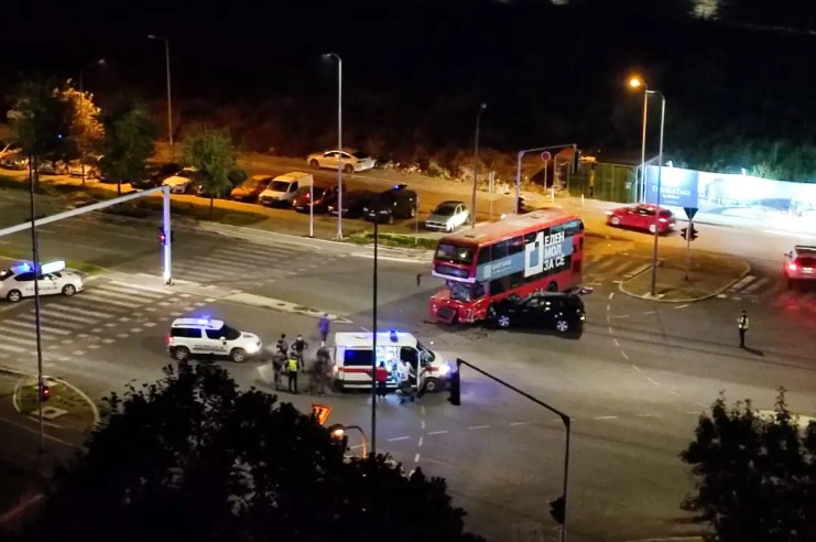 Ноќеска вo 23.50 часот во полиција било пријавено дека во Скопје, на крстосницата од бул.АСНОМ со сервисна улица се случи сообраќајна несреќа помеѓу автомобил марка БМВ со скопски регистарски ознаки, управувано од С.Ј.(29) од Скопје, и автобус на ЈСП, управуван од С.Б.(33) од Скопје.