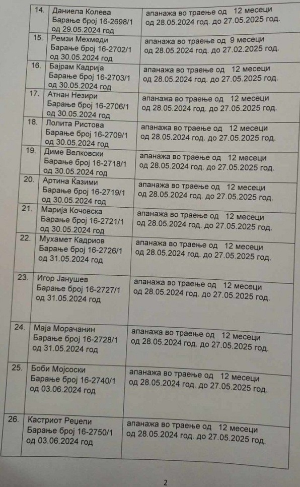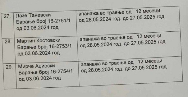Пратениците побарале апанажа во траење од 12 месеци, односно до 27 мај 2025 година. Само еден пратеник побарал апанажа од 2 месеца и 10 дена зашто потоа оди во пензија.