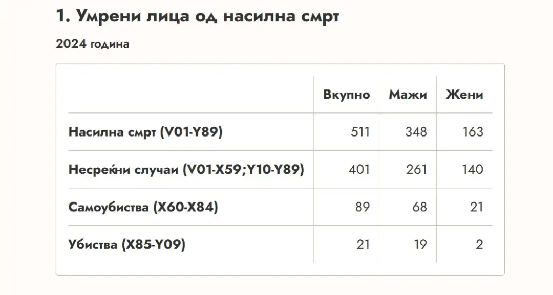 Во структурата на умрените од насилна смрт според полот, како и во претходните години, и во 2024 година поголемо учество имаат машките лица, и тоа 68.1 %, а 31.9 % жени.