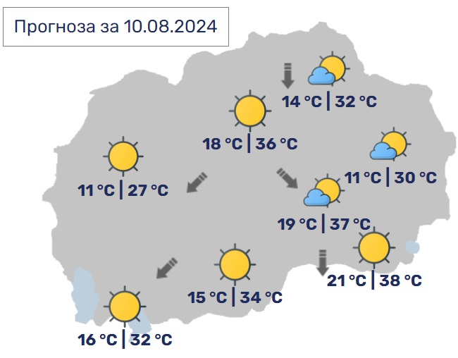 Утре времето ќе биде сончево и многу топло. Ќе дува слаб а долж Повардарието умерен ветер од северен правец. Во Скопје сончево и топло со умерен ветер од северен правец. Дневните температури ќе се движат од 29 до 38 Целзиусови степени.