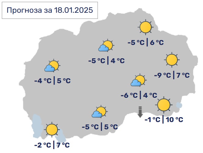 Утрe наутро времето ќе биде студено со појава на магла по одделни котлини, а преку денот сончево и тивко со мала до умерена облачност. Минимална температура ќе се движи од -8 до 0, а максималната од 3 до 12 Целзиусови степени.
