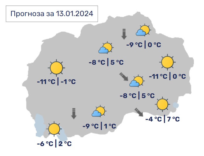 Во Скопје сончево со мала облачност. Ќе дува слаб до умерен ветер од северен правец. Минималната температура ќе се спушти до -8, а максималната ќе достигне 5 степени.
