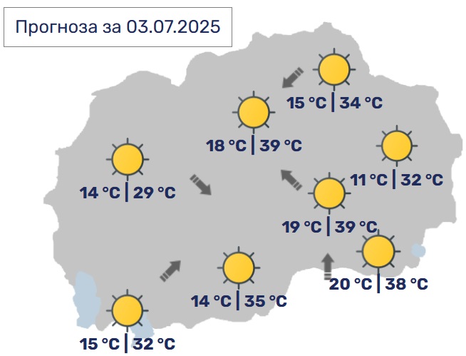 И во наредните три дена ќе имаме сончево и многу топло време со слаб до умерен ветер од јужен правец и температури и над 40 Целзиусови степени.