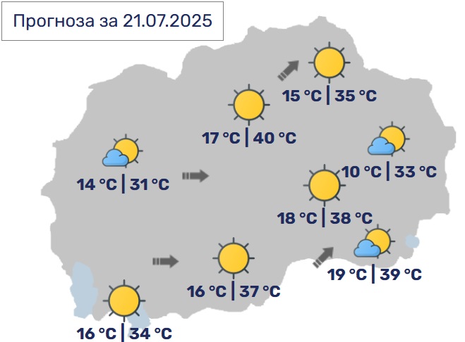 Во Скопје, сончево и многу топло со слаб до умерен ветер од југозападен правец. Минималната температура ќе се спушти до 17, а максималната ќе достигне до 40 степени.