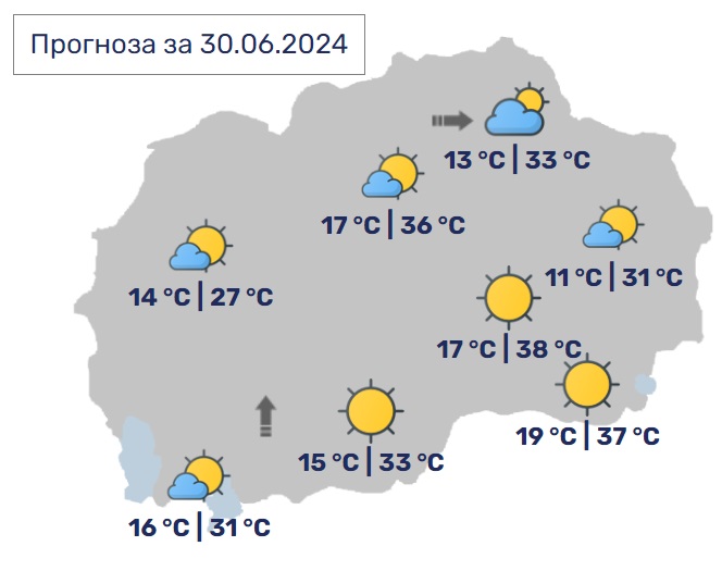 Утре времето во Македонија ќе биде сончево и многу топло со слаб до умерен ветер од јужен правец. Кон крајот на денот ќе има услови за локална појава на невреме со пороен дожд, грмежи, силен ветер и град. УВ индескот ќе биде 9, а дневните температури ќе достигнат до 39 Целзиусови степени.