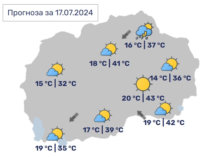 Во Скопје времето ќе биде сончево и многу топло, попладне со мала до умерена облачност. Минималната температура ќе се спушти до 20, а максималната ќе достигне до 41 степен.
