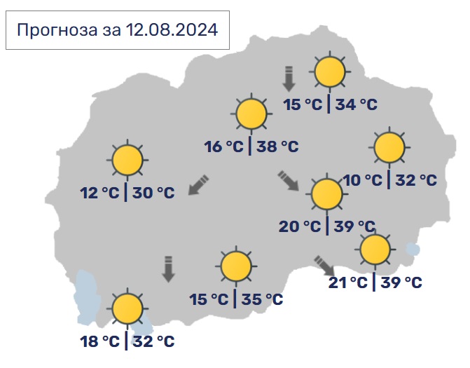 Синоптичарите информираат дека под влијание на многу топла воздушна маса од југ, од денеска до крајот на седмицата времето ќе биде претежно сончево и многу топло. Особено топло ќе биде до среда кога дневната температура наместа ќе надминува 40 степени и на повеќе места ќе биде активирано портокалово ниво за опасност од високи температури.