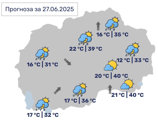 Во Скопје, сончево и многу топло со слаб ветер од северен правец. Попладне и во вечерните часови во делови од котлината ќе биде нестабилно со пороен дожд, грмежи и засилен ветер, краткотрајно во форма на невреме. Минималната температура ќе се спушти до 22, а максималната ќе достигне до 39 степени.