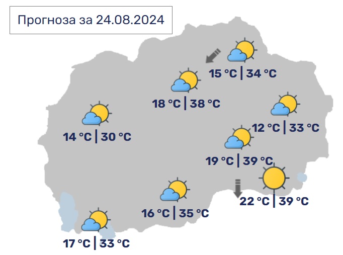 Во Скопје сончево и топло со мала до умерена облачност и со слаб северен ветер. Минималната температура ќе се спушти до 18, а максималната ќе достигне до 38 степени.