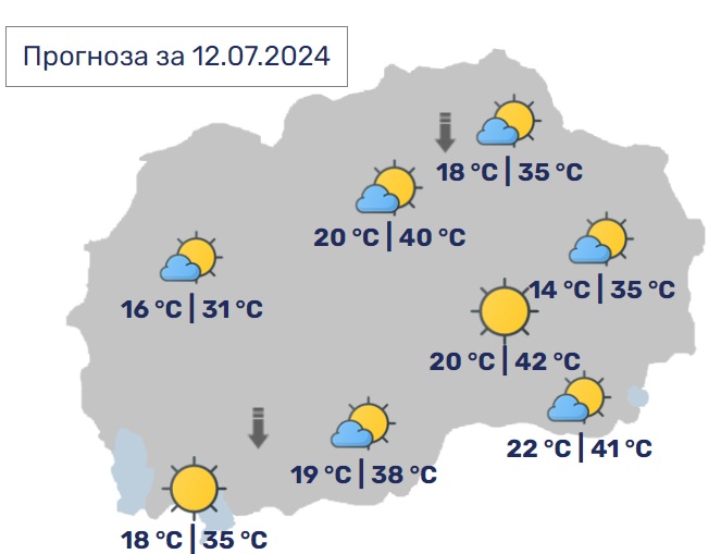Во Скопје времето ќе биде сончево и многу топло. Минималната температура ќе се спушти до 20, а максималната ќе достигне до 40 степени.