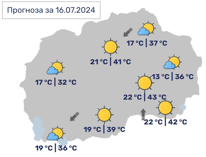 Утре времето ќе биде сончево и многу топло, попладне со мала до умерена локална облачност. Ќе дува слаб до умерен ветер од североисточен правец. Дневните температури ќе достигнат до 43 Целзиусови степени, а УВ индексот – 10.