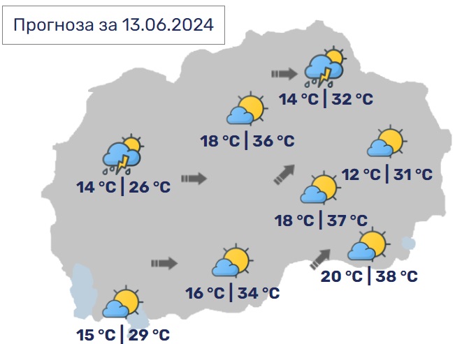Утре времето ќе биде променливо облачно со повремен пороен дожд и грмежи. Локално процесите ќе бидат поинтензивни во форма на краткотрајно невреме. Дневните температури ќе се движат од 24 до 31 Целзиусов степен.