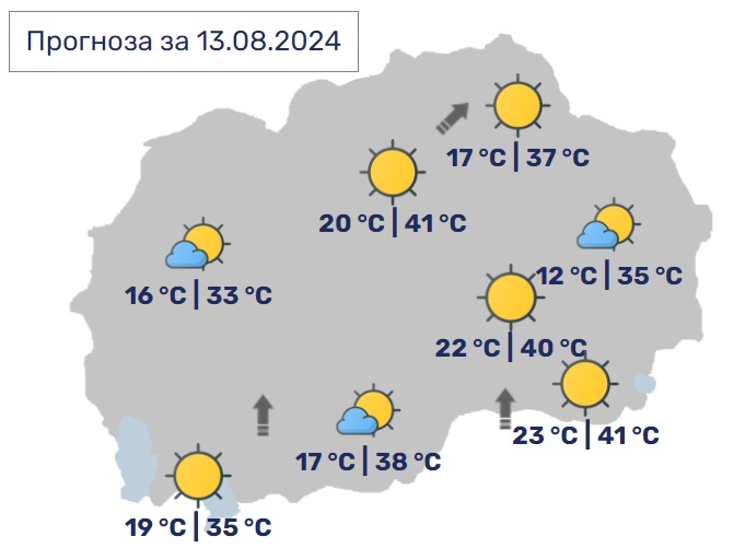 Прогнозата и за утре е сончево и многу топло со мала до умерена облачност. Ќе дува слаб до умерен ветер претежно од јужен правец. Попладне во северните планински делови ќе има услови за локална појава на краткотраен пороен и дожд и грмежи. Дневните температури ќе се движат од 34 до 40 Целзиусови степени. УВ индексот ќе биде 9.