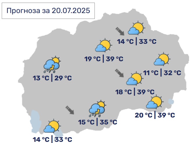 Во Скопје, сончево и многу топло со мала до умерена облачност. Ќе дува слаб до умерен ветер од северозападен правец.