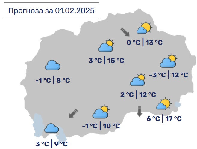 Дневните температури ќе се движат од 8 до 17 Целзиусови степени.