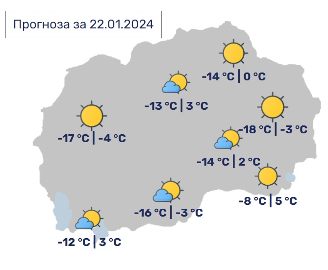 И утре наутро времето ќе биде многу студено, преку денот сончево со мала до умерена облачност и со слаб до умерен северен ветер. Во Скопје, сончево со мала до умерена облачност и со слаб северен ветер.