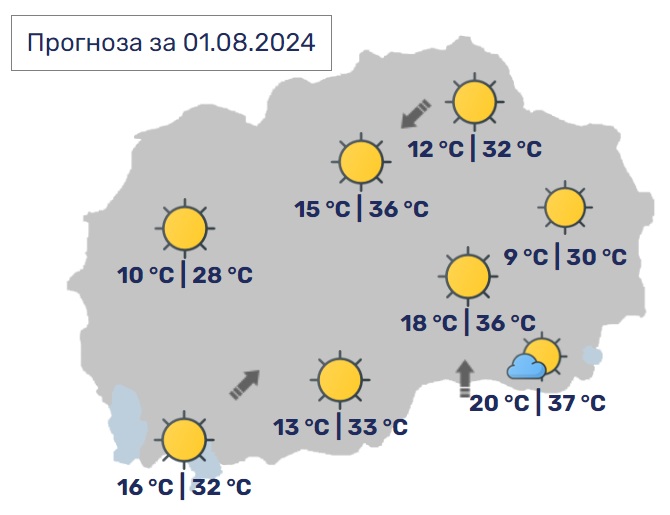 Во Скопје времето ќе биде сончево и топло со слаб ветер од променлив правец. Минималната температура ќе се спушти до 16, а максималната ќе достигне до 36 степени.